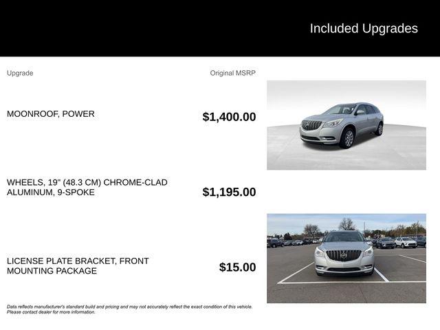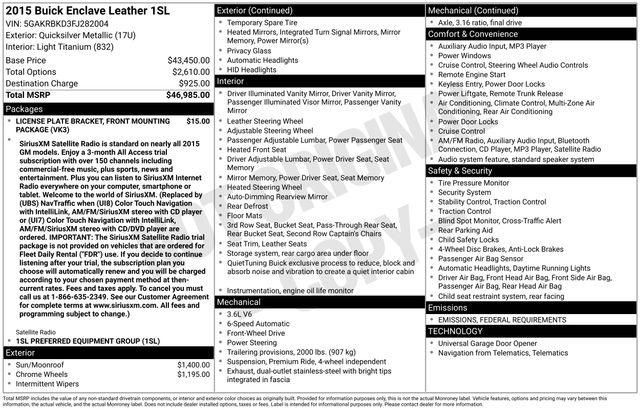 CARFAX One-Owner.Recent Arrival!Quicksilver Metallic 2015 Buick Enclave Leather Group FWD 6-Speed Automatic Electronic with Overdrive 3.6L V6 SIDI VVTGOOD TIRES REAR BACK UP CAMERA LEATHER GOOD BRAKES RECENT TRADE IN Enclave Leather Group 4D Sport Utility 3.6L V6 SIDI VVT 6-Speed Automatic Electronic with Overdrive FWD Quicksilver Metallic Ebony w/Ebony Accents w/Perforated Leather-Appointed Seat Trim 19"" x 7.5"" Aluminum (4) Wheels 3rd row seats: split-bench 6 Speakers 7-Passenger Seating 8-Way Power Driver Seat Adjuster 8-Way Power Passenger Seat Adjuster Air Conditioning Alloy wheels AM/FM radio: SiriusXM Automatic temperature control Brake assist CD player Delay-off headlights Electronic Stability Control Exterior Parking Camera Rear Four wheel independent suspension Front Bucket Seats Front Center Armrest w/Storage Front dual zone A/C Fully automatic headlights Heated Driver & Front Passenger Seats Heated front seats Heated Steering Wheel High intensity discharge headlights: Bi-Xenon Memory Settings Panic alarm Passenger door bin Perforated Leather-Appointed Seat Trim Power Liftgate Power passenger seat Power Tilt-Sliding Moonroof Preferred Equipment Group 1SL Radio data system Radio: Color Touch AM/FM/CD w/IntelliLink Rear air conditioning Rear Parking Sensors Rear window defroster Rear window wiper Security system Side Blind Zone Alert w/Cross Traffic Alert SiriusXM Satellite Radio Speed control Speed-sensing steering Traction control Variably intermittent wipers.Awards: * JD Power Automotive Performance Execution and Layout (APEAL) Study * 2015 KBB.com 5-Year Cost to Own Awards * 2015 KBB.com Brand Image AwardsOur dealership is family owned and operated and has been serving Oakland County and its surrounding communities since 1954. Lunghamer Buick GMC is focused on excellent customer service. We will find the right vehicle for your life style the right financing to fit your budget and a total ownership experience second to none. We are here to service you. Joe Knows that service repairs never fit into your busy schedule. That's why we offer convenient service hours Monday through Friday 8am-5pm. We feature highly trained service advisors and factory trained technicians we feature state of the art equipment and we realize that repairing your vehicle right the first time at a fair price will keep you coming back for years to come. We invite you to come down and take a stroll through our large inventory of new and used vehicles talk to our sales and service advisors have a free coffee tea or water and make Lunghamer Buick GMC your sales and servicing dealer. Call us today at 248-461-1000 and let us know how we can help!""JOE KNOWS USED CARS!"" * CPO APR AVAILABLE ON SELECT MODELS FOR WELL QUALIFIED BUYERS.Reviews: * If you want an upscale hauler that can comfortably seat seven or eight people and boasts a quiet comfortable ride in the $40 000 range the 2015 Enclave offers good road manners and much vehicle for the money. Source: KBB.com * Smooth and quiet ride; luxurious cabin; generous cargo capacity even behind the third row; seating for up to eight; top safety scores. Source: Edmunds